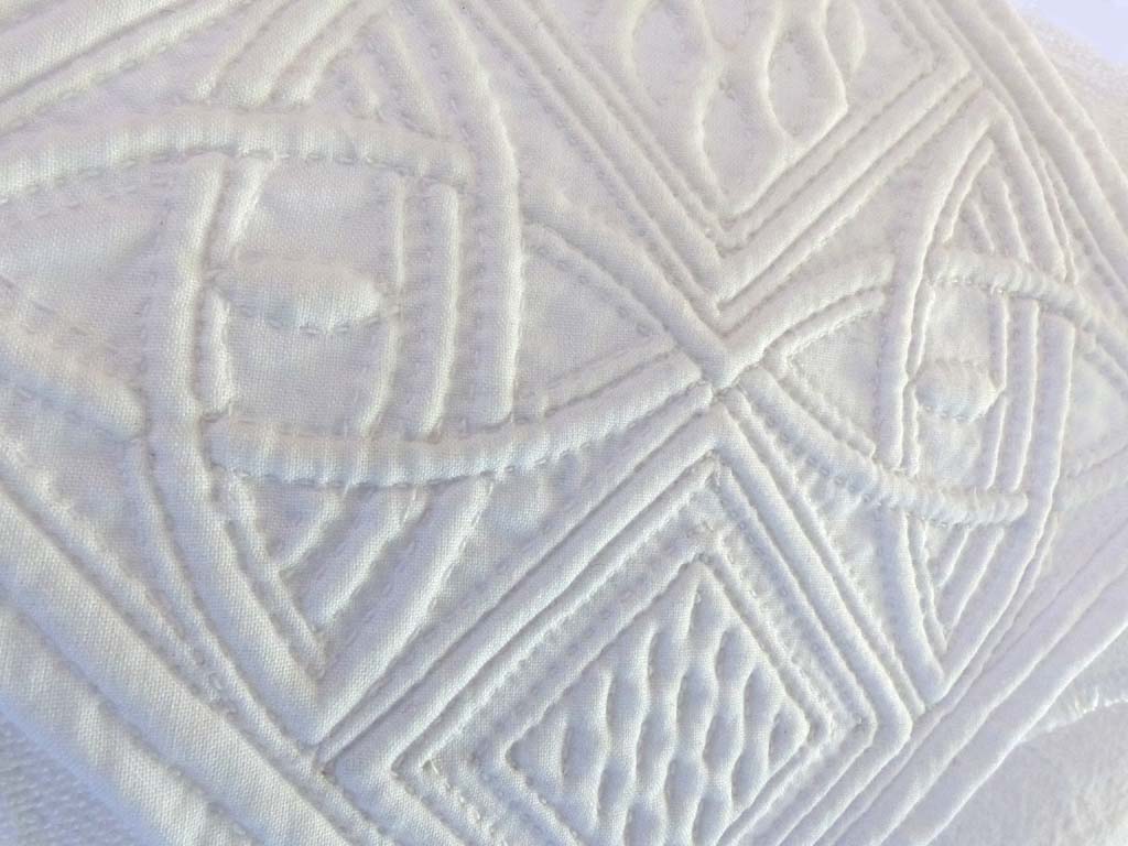 For those who are not so familiar with this technique, here is a quite simple description : Boutis is practiced on one of the two layers of cambric sewn together one upon the other and on which the pattern has been traced with a pencil. Then, upon the lines of the drawing one sews very small running stitches, thus creating pockets: this process is called 'sertissage'. Once the sertissage finished, one starts the 'méchage', which consists in stuffing the pockets with cotton knitting yarn, in order to create volume and relief. Finally, after having edged the work, the fabric is washed in order to give it its final appearance : a piece of lightness and translucence.